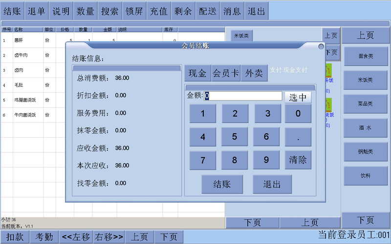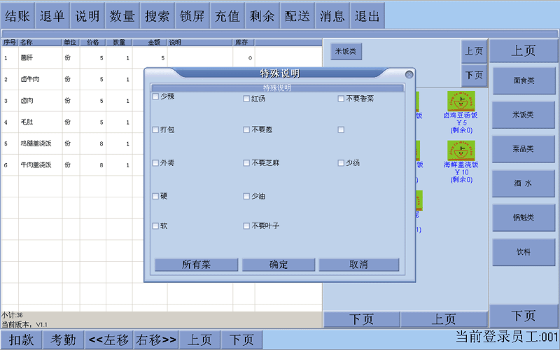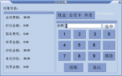 前臺(tái)接待開單、點(diǎn)菜、加菜、退菜、附加口味做法、并單、移臺(tái)、房臺(tái)預(yù)訂、菜品預(yù)訂、外賣、結(jié)單等日常操作;臨時(shí)菜品(菜譜未設(shè)置但本店還能做的菜品)管理;支持現(xiàn)金、免單、簽單、會(huì)員卡、支票、信用卡等多種付款方式;會(huì)員級(jí)別不同可以享受不同級(jí)別的優(yōu)惠;預(yù)訂顯示可以有效防止房臺(tái)沖突;其他簡(jiǎn)單的查詢和統(tǒng)計(jì)。